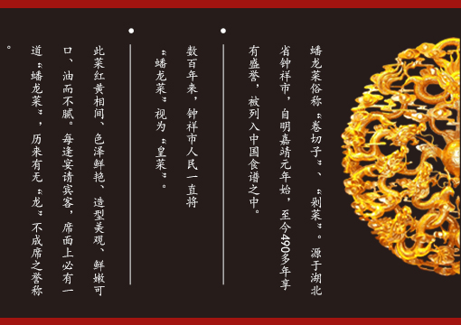 湖北鐘祥市人民一直將蟠龍菜視為“皇菜”。此菜紅黃相間、色澤鮮艷、造型美觀、鮮嫩可口、油而不膩。每逢宴 請(qǐng)賓客,席面上必有一道“蟠龍”菜,歷來(lái)有無(wú)“龍”不成席之譽(yù)稱。
